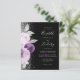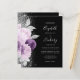 Den lämnat kant i denna elegant är en modern bröllopsinbjudan med en blommigt i lila- och lavender, som trimmas med silver faux foil och faux glitter foliage och sprinklas med silver faux glitter. Anpassadet kombinerar handskriftsskript för blek silver grått, mönsterfärg och kursivt typsnitt mot svart bakgrund. Baksidan har en matchande blommigt.
