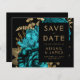 Den här eleganten har det moody bröllop spara datum-kortet en lush, romantisk blommigt buquet i turkos med guld faux foil och glitter foliage mot svart bakgrund. Anpassa guld-färgad-texten i snyggt typsnitt på en svart rektangel och lägg till bröllop webbplats-URL:en till den helsvarta baksidan.