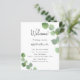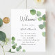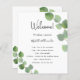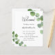 En modern elegant, bröllopsprogram, tidslinje. Vit bakgrund, dekorerad med eukalyptus greenery, spriggar. Anpassa och lägg till information om namn och bröllop. Svart färgad brev. Om du har mer text kan du minska radavståndet och även lägga till text på baksidan.