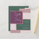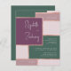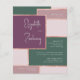 Denna moderna geometriska bröllopsinbjudan innehåller en mönster av överlappande rektanglar i grönt och muterade nyanser av lila, åtskilda av ro guld faux foil gräns. Namnen för briden och trimmen visas i skripttypografin för trendig blek grått, med den återstående texten i sans serif-teckensnitt. Kortets baksida är en solid grönt.