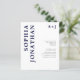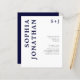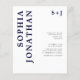 Budgetera alla i ett med detaljer Modern kalltypografi klassisk marin blå monogrambröllopsinbjudan... Vår prisvärda "All in One"-inbjudan till marint blåbröllop innehåller fet serif-typografi i kombination med sans serif-text för en enkel och modern bröllopsinbjudan med monogrammet. Baksidan av inbjudan innehåller alla de uppgifter som du normalt skulle se på separata kort i bröllop-paketet, inklusive mottagningstid och plats, logialternativ, bröllop webbplats, OSA- och registerinformation. Den här moderna bröllopsinbjudan från stil var designad för att vara både trendig- och budgetmedveten.. för att inte nämna tidsbesparing. All exempeltext kan enkelt revideras med egen information om anpassningsmallen. Observera att du har möjlighet att köpa kuvert med dina inbjudningar eller skaffa egna, om du har en föredragen papper produktleverantör.