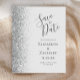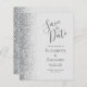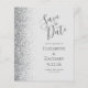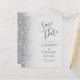 Det moderna bröllop spara datum-kortet från elegantens lämnat kant har ett silver faux glitter gräns. I anpassadet kombineras grått-handskrift med kol och typsnitt på blekens grått-bakgrund. Baksidan har en matchande grått- och silver-design.