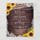 Rustiska inbjudningar till landsbyggsbröllopet tryckta på lättviktiga pappra ideal för konservativets budgetar och handleverans till gästerna. Vackert land-trä med solblommor, snöre och ljus. All text är redigerbar för att ändra formuleringen så att den passar dina behov. Kontakta designern via Zazzle-Chattan eller makeitaboutyoustore@gmail.com om du vill att designen ska ändras, på en annan produkt eller samordnande artiklar.