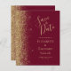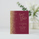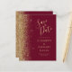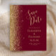 Det moderna bröllop spara datum-kortet från elegantens lämnat kant har ett guld faux glitter gräns. Anpassadet kombinerar handskrift, rityta och kursivt typsnitt i blek guld-färgad med en burgundröd bakgrund. Baksidan har en passande burgundi- och guld-design.