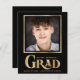 Ett budgetvänligt alternativ för att tillkännage ditt student framgång för familj och vänner. Den här elegantens svarta studenten-meddelande visar hans eller hennes favoritfoto i ram i guld faux metallic foil och "GRAD" skrivet i fet guld faux metallfolie typografi. Lägg enkelt till hans eller hennes namn, skolår och klassår.