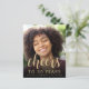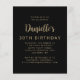 På framsidan av inbjudan till 30års födelsedag finns den hederlige gästen med en textövertäckning av guld-färgaden. "Bedragare" i ord visas i kalligrafiskript för elegant guld-färgad, följt av "till 30 år" och gästen för hedersans namn och födelsedag i sans serif font. Med en mörk skärm kan du göra så att texten visas. Anpassa den omvända sidan med informationen om namn och party på en svart bakgrund. Ett underbart sätt att fira någon som blir trettio! (Obs! Kuvert inkluderas inte automatiskt i den här budgetinbjudan. Om du vill lägga till kuvert i din beställning användor du listrutan "Kuvert".)
