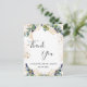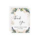 En möhippa-tank som du kortar. En chic vit bakgrund som dekorerats med eukalyptus greenery. På framsidan skriver stora svarta färgader skript och text: Tack, text och datum. Tillbaka: Anpassa och lägg till tackkort och namn.