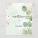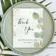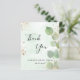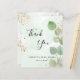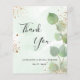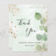 En möhippa tack. En grönt vattenfärgad bakgrund som dekoreras med eucalyptus greenery och faux guld glitter stoft. På framsidan skriver stora svarta färgader skript och text: Tack, text, rubrik och datum. Tillbaka: Anpassa och lägg till tackkort och namn.