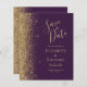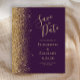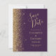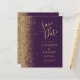 Det moderna bröllop spara datum-kortet från elegantens lämnat kant har ett guld faux glitter gräns. Anpassadet kombinerar handskrift, rityta och kursivt typsnitt i blek guld-färgad med mörkens lila. Den omvända sidan har en lila- och guld-design som matchar mörkens .
