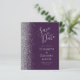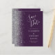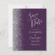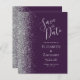 Det moderna bröllop spara datum-kortet från elegantens lämnat kant har ett silver faux glitter gräns. Anpassadet kombinerar handskrift, tryckplåt och kursivt typsnitt på mörkens lila. Den omvända sidan har en matchande lila- och silver-design.