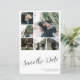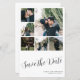 Elegant chic enkel trendig avslappnad handskriftsskript 6 förlovnings par fotokollage personlig budget för överkomlig bröllop spara datum-kortmall. Enkel att anpassa på båda sidor med text och bilder.