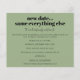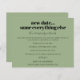Ett ekonomiskt alternativ i BUDGET på en mindre storlek på 4,5 x 5,6 tum (110 lbs vikt), som är av samma tjocklek som ett vykort (är dock inte lämpligt för använda som vykort). OBSERVERA ATT DET FINNS EN inbjudan per lakan. Bröllop nytt datum samma allt annat. När sak inträffar och tyvärr måste datumet för bröllop ändras, kommer detta att göra det möjligt för er att informera era gäster om ert nya datum så snart som möjligt. Den här enkla typografiska utformningen med svart text på sidans grönt är fullt anpassade. Anpassa texten på framsidan och baksidan enkelt. Du kan också ändra teckensnittet stilar och färg och färg i bakgrunden om du vill genom att anpassa ytterligare alternativ. Om du behöver hjälp, meddela mig.