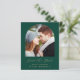 Den här enkla, minimalistiska Spara datumkortet innehåller en boho-fotobåge ovanför orden "Spara datum" i handskriftsskriptet elegant guld-färgad, följt av parets namn, bröllop datum och stad i sans serif-teckensnitt på en framväxande grönt. Lägg till ett mer detaljerat meddelande med ytterligare information om det omvända.