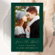Den här enkla, minimalistiska Spara datumkortet innehåller ett foto över ord "Spara datum" i handskriftsskriptet elegant guld-färgad, följt av parets namn, bröllop datum och stad i sans serif-teckensnitt på en framväxande grönt. Lägg till ett mer detaljerat meddelande med ytterligare information om det omvända.