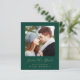 Den här enkla, minimalistiska Spara datumkortet innehåller ett fyrkantigt foto ovanför orden "Spara datum" i handskriftsskriptet elegant guld-färgad, följt av parets namn, bröllop datum och stad i sans serif-teckensnitt på en framskjuten grönt. Lägg till ett mer detaljerat meddelande med ytterligare information om det omvända.