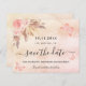 Ett giftigt och trendig Spara datumkortet för en Quinceañera, 15:e födelsedagsfesten. En rosa, ro guld-gradientbakgrund som dekoreras med blommigtar för rosa, pampasgräs och fjärilar. Anpassa och lägg till datum och namn/ålder. Texten: Spara datumet skrivs med ett stort trendig-handskript i stil.
