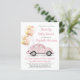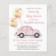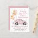 En budgetvänlig och söt drivenhet genom flicka-duschinbjudan med pastellskript för rosa och en vattenfärgsillustration av en rosa bil med guld och rosa ballonger. Du kan enkelt anpassa informationen för enhet-by-party.