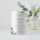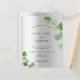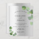En modern, elegant och minimalistisk bröllopsinbjudan. Faux silver metallisk tittar bakgrund dekorerad med eukalyptus greenery, sprigs. Anpassa och lägg till information om namn och bröllop. Svart färgad brev.