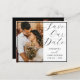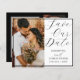 Elegant spara datum meddelande är prefekt för att få era bröllop-planer i rörelse. Den har en fotomall och stor "spara datumet"-typografi i svart på vit bakgrund. Anpassa med dina egna uppgifter.