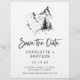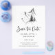 Budget Rustic Wilderness Save the Date Invation (spara datuminbjudan) har en hand som illustrerar det stora berget och det evergreen gräs träd med handskrivet manusformat. Spara datumet ingår i en samling.