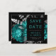 Den här eleganten har det moody bröllop spara datum-kortet en lush, romantisk blommigt bouquet i tårblått med silver faux foil och glitter foliage på svart bakgrund. Anpassa silver grått- och tealtexten i snyggt typsnitt på en svart rektangel och lägg till bröllop webbplats-URL:en till den helsvarta baksidan.