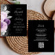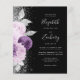 Den lämnat kant i denna elegant är en modern bröllopsinbjudan med en blommigt i lila- och lavender, som trimmas med silver faux foil och faux glitter foliage och sprinklas med silver faux glitter. Anpassadet kombinerar handskriftsskript för blek silver grått, mönsterfärg och kursivt typsnitt mot svart bakgrund. Lägg till ytterligare information på baksidan tillsammans med en QR-kod som hjälper dina gäster att besöka webbplatsen för bröllop.