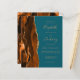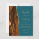 Den lämnat kant i eleganten i den moderna bröllopsinbjudan innehåller en bränd vattenfärgad orange i gräns som trimmas med faux guld glitter. Anpassadet kombinerar handskrift, rityta och kursivt typsnitt med guld-färgad på en helblå bakgrund. Den omvända sidan har en matchande agate-design.