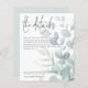 Bröllop Information om Eucalyptus-skripthölje. Ett budgetmässigt prist pappert alternativ som är lämpligt för bilagor. Berätta för dina gäster om detaljer som riktningar och bostadsinformation för bröllop när du skickar inbjudningar. Den här eleganten har ställt in stor typografi för snyggten för rubriken. Information och resten av texten kan enkelt personlig till orden. Vackra eukalyptus lämnar i mjuk tealblått dekorerar högernas hand och tonas gradvis in i bakgrunden och en del av texten överläggs ovanpå. En koordinerande pulverblå bakgrund är på baksidan som kan ändras till ett annat färg om du vill genom att anpassa ytterligare alternativ.