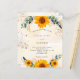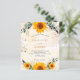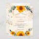 En vit och guldfärgad bakgrund som dekoreras med solblommor, eukalyptus grey och gyllene löv och faux guld glitter stoft. Anpassa och lägg till information om namn och party.