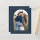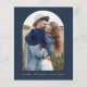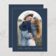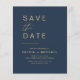 Budgetera Bröllop-marinblått och Guld Spara datumkort som har ett foto på framsidan. Spara datumkorten innehåller en modern handskriven kursiv skripttypografi som är elegant, enkel och modern till använda efter att du har minimalistisk enkel bröllopsdag firande.