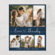 Budget, Modern, Elegant Heart-teckensnittsskript Bröllop 5 Photo Collage Prisable Tack Flyer in Navy Blue and White. Snyggt, minimalistisk bröllop-kortmall med fem (5) rasterfotokollage på framsidan och ett (1) foto på baksidan. "Kärlek och tack" text i ett kursivt, handskrivet kalligrafiskt, sött hjärtteckensnittsskript med dekorerat svan. Anpassa med ditt namn och tack för meddelandet. Om du behöver hjälp eller matcha objekt kontaktar du designern!