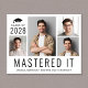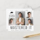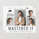 Budgetvänlig magisterexamen i studenten med ett 4 bild fotokollage, "Mastered it", skrivet över grund i stora huvudstäder i brev och hans eller hennes klassår, namn och college eller universiteten i enkel typografi. Lägg till ytterligare ett foto och ett personlig på baksidan.