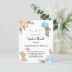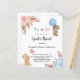 För en modern boho stil babydusch avslöjar gender party. En vit bakgrund. Dekorerad med ro guld, rosa och ljusblå blommigtar, rosor, pampasgräs och två nallar med ballonger. Anpassa och lägg till uppgifter om namn och party.