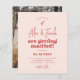 En roligt och funky bröllopsinbjudan. Budgetkortets framsida har en krämfärgad bakgrund med körsbärsröd rosa. Parets namn är skrivet i ett modernt handskriftsskript i stil med texten "är gifta sig" i groovisk retrotypografi. Ovanför namn finns en handritad illustration av gnistran. Nedan skrivs händelseinformationen ut med enkla sans-serif-versaler - en enkel men snyggt design för en avslappnad bröllop. Korten återgår till ett foto av anpassningsbarna. Parets namn och dagen för den stora dagen finns också på baksidan av kortet. Som en del av budgetvalet för Zazzle är lakan inte en vanlig storlek eller papper kvalitet för inbjudan. Om du vill ha den här designen på ett inbjudningskort kan du hitta den i samlingen eller användan Zazzle Make Maskin för att överföra den till valfri produkt. Visa den samling som är länkad på den här sidan för matchande artiklar eller besök vår butik för fler bröllopsinbjudningar!