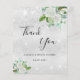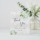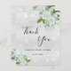 En Möhippa tack. En faux silver metallisk tittar bakgrund färg. Dekorerad med vita blommigtar, grönt och faux glitter stoft. På framsidan, ett skript med stora bokstäver och texten: Tack, text, titel och datum. Tillbaka: Anpassa och lägg till tackkort och namn.