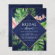 Budgeten Tropical Handflatan Watercolor Faux Ro Gold Foil Geometric och Navy Blue Background Bröllop Inbjudningskort för möhippa - omfattar vacker och elegant manustypografi med moderna botaniska rosa blommor och tropiska hawaiiska grey för att speciella Bride ska vara firande.