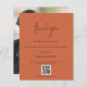 Skript QR Code Bröllop Photo Gallery Terracotta Tack. Ett budgetmässigt prist mindre än 4,5 x 5,6 tum alternativ. Finns i ett SEMI-GLOSS 110 lb-kort LAGRAR, vilket är standardalternativet (tjockare för inbjudningar), ELLER SATIN AVSLUTAR 80 lb PAPPER LAGRAR (perfekt för bilagor). Kuvert är ett extra som tillval och är något större än det storleka kortet. En minimalistisk typografisk design med ett set handskript för Tack i snyggten stil. På baksidan byt du ut bild mot din egen favorit från din dag som en keepy för dina gäster. Anpassa enkelt resten av texten med ditt meddelande och namn och ersätt QR-kodexemplet med ditt eget radavstånd till fotogalleriet i online bröllop.
