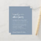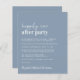 Enkel budgetvänlig dammiga blå bröllop-annonsering och mottagningsinbjudan. Framsidan kännetecknas av "Lyckligtvis ända efter Party" i en blandning av ett vitt skript i contemporaryn och djärv modern vit typografi. Anpassa ditt meddelande och din inbjudan och lägg till namn i ett namnteckning skript. På motsatt sida anger du URL:en för bröllop-webbplatsen adress för att skapa en QR-kod för dina gäster för att söka efter mer information och för OSANS online