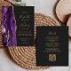 Det lämnat kant har en lila vattenfärgsagat gräns som trimmas med guld faux glitter. Anpassadet kombinerar handskrift, rityta och kursivt typsnitt med guld-färgad på en svart bakgrund. Den omvända sidan ger plats för bröllop-information på en solid skifferbakgrund, tillsammans med en QR-kodgäst som kan söka på din webbplats och OSA, vilket sparar kostnaderna för utskrift och utskick av separat OSA kort.