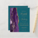 Det lämnat kant har en lila vattenfärgsagat gräns som trimmas med guld faux glitter. Anpassadet kombinerar handskrift, rityta och kursivt typsnitt med guld-färgad på en helblå bakgrund. Den omvända sidan ger plats för bröllop-information på en solid teal-bakgrund, tillsammans med en QR-kodgäst som kan söka på din webbplats och OSA, vilket sparar kostnaderna för utskrift och utskick av separat OSA kort.