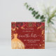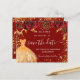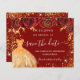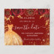 Ett giftigt och trendig Spara datumkortet för en Quinceañera, 15:e födelsedagsfesten. En snyggt röd bakgrund dekorerade röd ros, gyllene färgad faux glitter-gnistor och en klänning. Anpassa och lägg till datum och namn/ålder. Texten: Spara datumet skrivs med ett stort trendig-handskript i stil.
