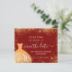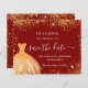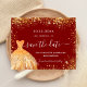 Ett giftigt och trendig Spara datumkortet för en Quinceañera, 15:e födelsedagsfesten. En röd snyggt som dekoreras med guldfärgad färgad faux glitter-gnistor och en klänning. Anpassa och lägg till datum och namn/ålder. Texten: Spara datumet skrivs med ett stort trendig-handskript i stil.