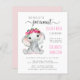 En budgetvänlig inbjudan till flicka sprinkle med "Vår söta lilla jordnöt är på väg" skriven i en blandning av rosa- och mjuk grått-typografi och ett söt-skript med svasch, och en vattenfärg på en söt flicka-elefant med en blommigt krans på huvudet. Anpassa namn i flicka och mor i rosa-typografi och sprinkelldetaljer i enkel modern grått-typografi.