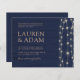 Inbjudan från elegant bröllop som har enkel, fetstilt typografi i ett lätt guld färg på en djup marin blå bakgrund med en varm träeffekt på struktur. Fintvätt ljus dekorerar sidan och tillför en charmig, romantisk glöd. Den här mallen för anpassade är perfekt för bröllop-, lada- eller kvällsteman, som blandar sofistikering med mysigt charm.