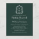 Den här vintage-inspirerade bröllopsinbjudan innehåller ett par vitt monogram initialer i ett öppet serif-teckensnitt ovanför och under en skiljelinje och omges av en konturkonst-vapensköld på en mörk grönt-bakgrund. På baksidan finns utrymme för information om bröllop på en solid mörk grönt bakgrund, tillsammans med en QR-kodgäst som kan söka efter webbplatsen och OSAN.