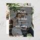 En modern och trendig allt-i-ett-fotobröllopsinbjudan som visar din bröllop-information över ett av dina favoritbilder med ett svart, genomskinligt överlägg och accentueras av ett elegant-vitt skript, men med ett öga på budgeten. Ett enkelt anpassade med bröllop-ceremonin i vitt för ett romantiskt men modernt utseende och snyggt. Kortets baksida har ett andra bild, onlinens instruktioner om OSA och förfallodatum, ett QR-nummer för anpassadet som dirigerar dina gäster till din bröllop webbplats, dina monogram och ditt datum i bröllop.