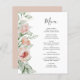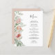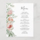 I den här romantiska menyn i bröllop, som är lämnat kant, finns en blommigt av vattenfärg med persikor, blommor och grönska. Anpassadet kombinerar handskrift, tryckplåt och kursivt typsnitt i grått i kol mot vit bakgrund. Den omvända sidan har ett samordnat starkt färg.