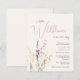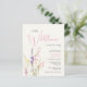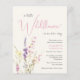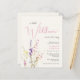 En elegant budgetvänlig duschinbjudan till flicka med lätt gräddfil som innehåller "lite vildblomma är på väg" är skriven i modern mjuk typografi och ett skript för rosa av snyggt, och en bohos-inspirerad vattenfärgbukett av vildblommor med lila, rosa och gult.