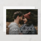 Det moderna skriptet Photo Bröllop spara datum har en elegant, minimal design med handskrift sparar datumet för vit typografi på ett utfallsfoto i fullt. Information om anpassadet och foto på framsidan. Baksidan ger ett personligt meddelande. Klicka på knappen Redigera om du vill anpassa designen.