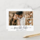 Budgeterad Elegant Modern minimalistisk kalligrafi, skript 3 fotokollage Spara datumkort i svartvitt. Den här romantiska delikata perfekten för modern bröllop. Har 3 (3) rutnätsfotokollage, en vismisk kalligrafi i handskrivet stil-swash-svan-teckensnitt med kärlek-hjärta. Enkel att anpassa den med dina uppgifter om bröllop och bilder. Prisvärda kort med låg billigt.